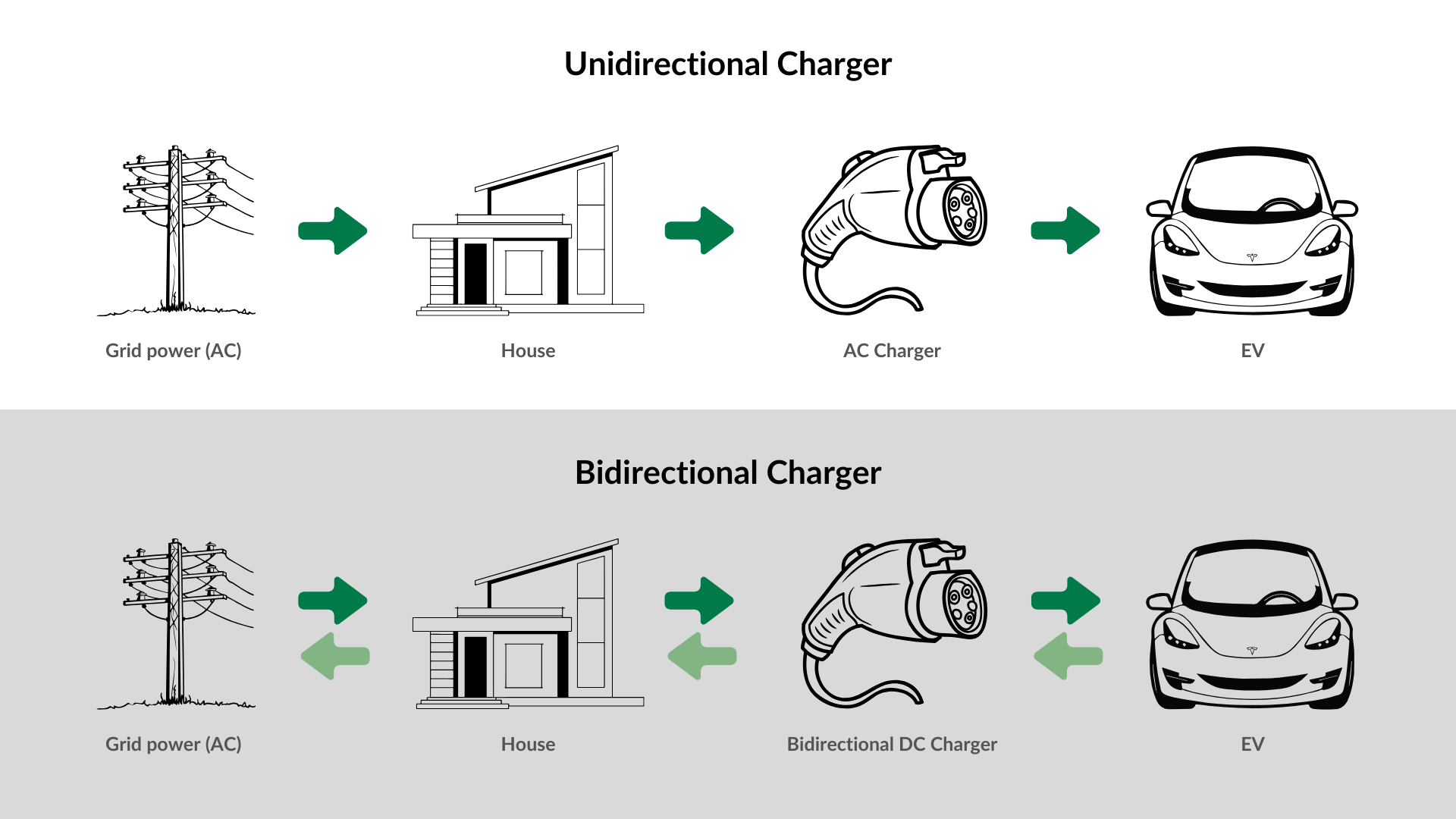 A bidirectional charger is an advanced type of charger that allows energy to flow both ways. Traditional EV chargers transfer AC electricity from a power source - such as the grid or solar panels - to your vehicle's battery, which is converted to DC electricity for storage. However, with a standard charger, energy can only move in one direction: from the source to the EV.